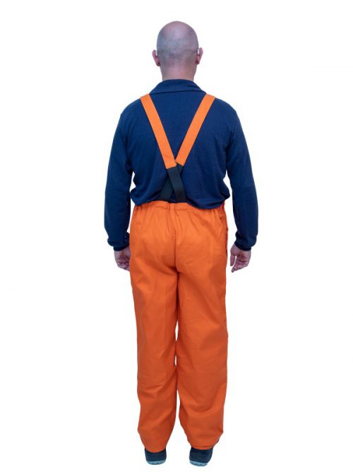 Pantalón de peto con bragueta de cremallera oculta por tapeta, elástico en cintura trasera, abertura con velcro en ambos costados. Bolso interior en el peto con cartera y cierre de velco. Dos bolsos interiores a la altura de la cintura accesibles desde el exterior y con cierre de velcro. Bajos de perneras con elástico interior, tirantes elásticos cosidos al trasero, ajustables mediante cierre de click.
